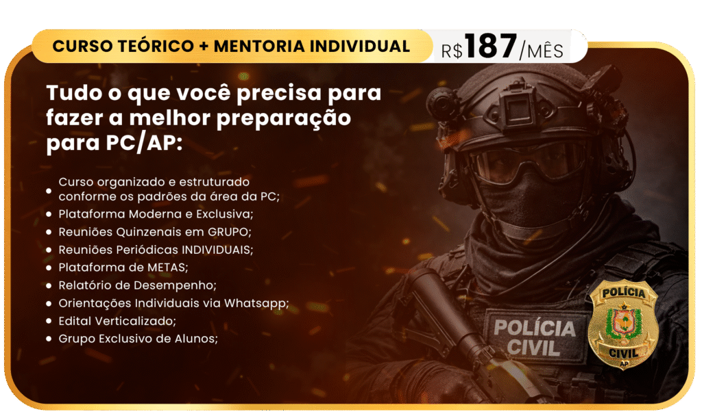 O curso foi estruturado para suprir todos os conteúdos exigidos no concurso da Polícia Civil do Amapá, com um plano sólido independentemente de quem organizar a prova: