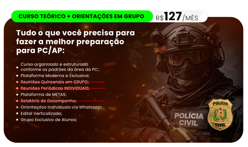 O curso foi estruturado para suprir todos os conteúdos exigidos no concurso da Polícia Civil do Amapá, com um plano sólido independentemente de quem organizar a prova: